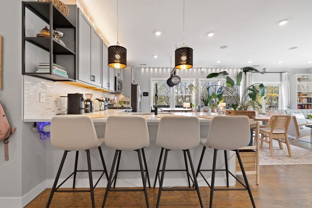 Kitchen: Flooring - Hardwood, Open Floorplan, Peninsula, Lighting - Pendant