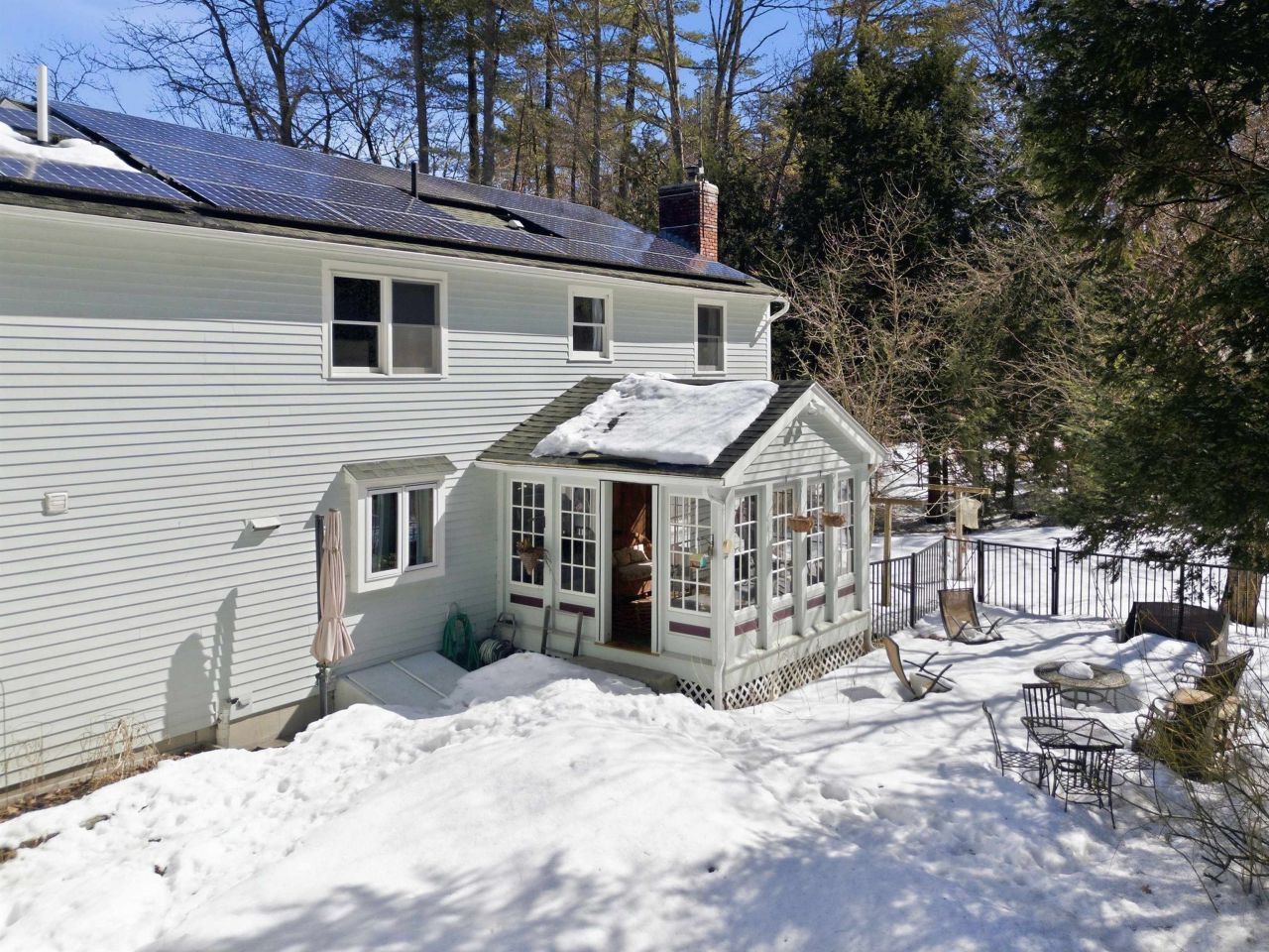 This spacious 4-bed, 4-bath Colonial offers the perfect blend of comfort, flexibility & energy-efficient living in a neighborhood close to Bow schools. Designed w/ sustainability in mind, the home features a seller-owned 12kW rooftop solar array w/ transferable warranty, natural gas heat & a high-efficiency furnace w/ integrated hot water heater-helping to significantly reduce energy costs year-round. Additional upgrades include radon & arsenic water systems. A standout feature is the 20x26 vaulted bonus great room, offering incredible versatility. Complete w/ cork flooring, a natural gas stove, private deck, walk-in closet, office nook, and adjacent 3/4 bath, this space is ideal for an in-law setup, guest suite, home office, or expansive family room. The main living area includes an open kitchen w/ Vermont-quarried granite countertops, birch cabinetry, center island & walk-in pantry, flowing seamlessly into the family room with a wood stove fireplace. Additional highlights include a front living room w/ pellet stove, formal dining room, and a three-season porch for extended enjoyment. Upstairs, you'll find 4 bedrooms, including a primary suite w/ an updated bath w/ tiled shower, heated floors & towel rack, plus a full bath with double sinks. Wood flooring runs throughout much of the home, including some boards milled directly from trees on the property-adding unique character. Outside, enjoy a backyard oasis w/ a heated in-ground gunite pool w/ chlorine-free oxidation/ionization system, patio, mature perennial gardens & fruit trees (peach, pear, apple) along with raspberry bushes. Backyard fencing encloses the pool & patio areas. Additional exterior features include an open wood shed & 2 basketball hoops. The insulated two-car garage is EV-ready w/ dual 240V charging outlets & an additional 20-amp circuit. With its energy-efficient upgrades, flexible bonus living space & exceptional indoor-outdoor features, this home offers a combination of practicality & lifestyle.