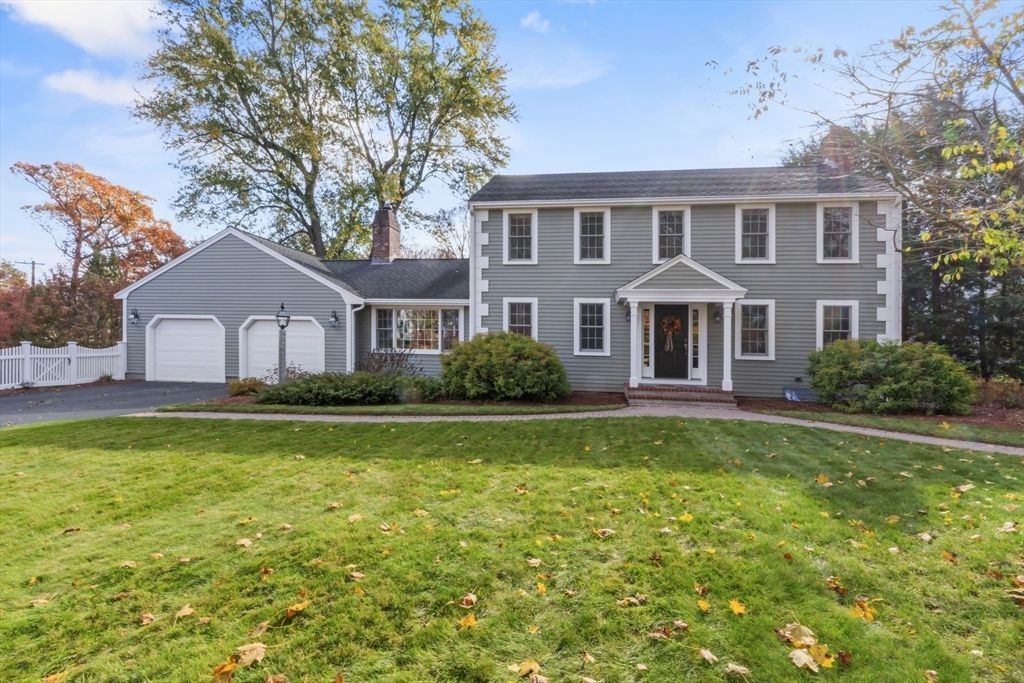 Prepare to be captivated by this picture-perfect 5-Bedroom Colonial set on a beautifully landscaped corner lot with a charming white picket fence. Meticulously maintained and showing like new, this home reflects impeccable care and thoughtful updates throughout a spacious, versatile floor plan.The first-floor Primary Suite addition offers comfort and convenience, while the spectacular vaulted dining room with exposed beams and a striking stone fireplace creates a memorable gathering space. The renovated chefs kitchen features upgraded cabinetry, countertops, and stainless appliances, with hardwood flooring throughout.Upstairs offers four generous bedrooms and a renovated bath. Enjoy the unique octagonal three-season room overlooking a tranquil waterfall feature. Outside are paver walkways, a fenced backyard, and a large garage. Conveniently located on a corner lot abutting a neighborhood with sidewalks and access to a nearby pool association. Open House this Saturday & Sunday
