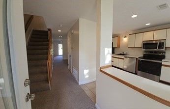 Welcome to your new home in the wonderful Maple Brook community.! This townhome is equipped with everything you need. Skylights in the breakfast area bring natural light ot the kitchen, creating a bright and inviting space. Just beyond the kitchen you will find a dining room, living room and half bath. Sliding doors from the living room lead to your private deck., which overlooks a lush green backyard. Upstairs there are two generuosly sized bedrooms; one features a sink and vanity area and connects to the full bath. Washer and dryer hook ups are conviently located on the second floor between the two bedrooms. You'll also enjoy ample closet space, along with a full basement for additional storage. Plus, there are two parking spots. Don't miss out on the opportunity to rent this fantastic town home in a well managed communtiy.