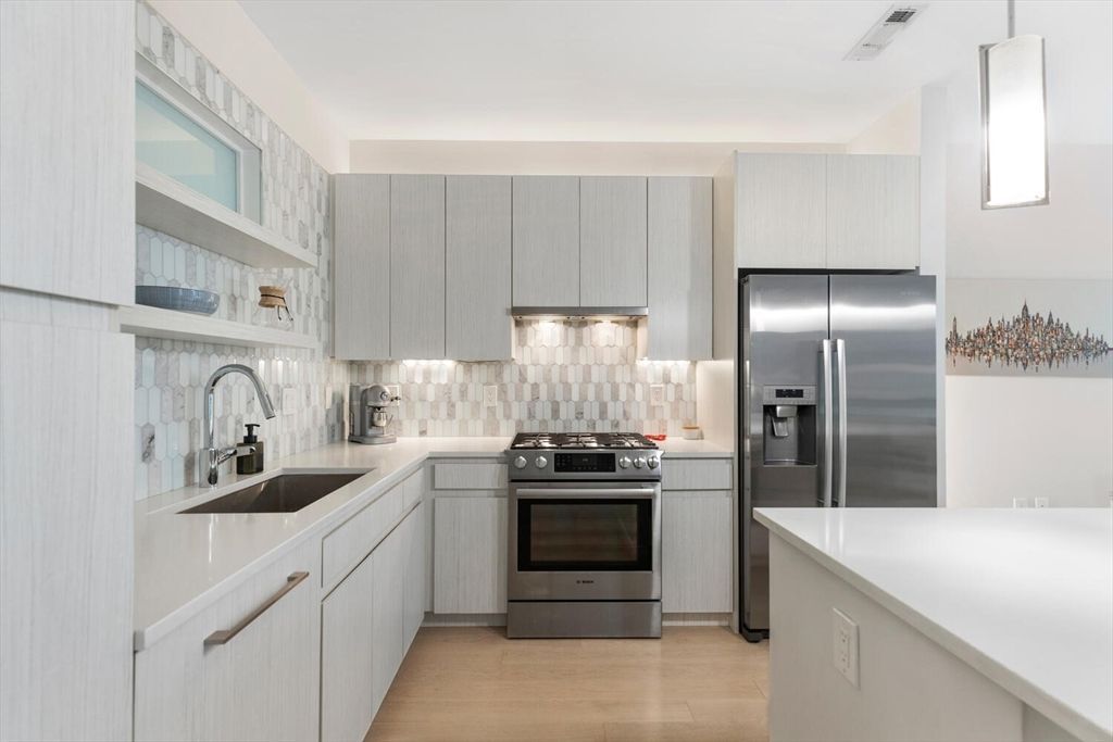 PORT 45 - 1 BEDROOM + DEN W/ PARKING | Experience the pinnacle of city living in this meticulously maintained condo with a private balcony. The kitchen features custom cabinetry, a Bosch appliance package, and quartz countertops. Additional highlights include hardwood flooring throughout, central A/C, high ceilings, Elfa closet systems, a Nest Thermostat, and in-unit laundry. Port 45 offers a concierge, fitness center, resident lounge, common roof deck with grills, and heated garage parking. Conveniently located near Southie, Seaport, and South End favorites, with easy access to the Red Line, I-93, I-90, and multiple bus routes.