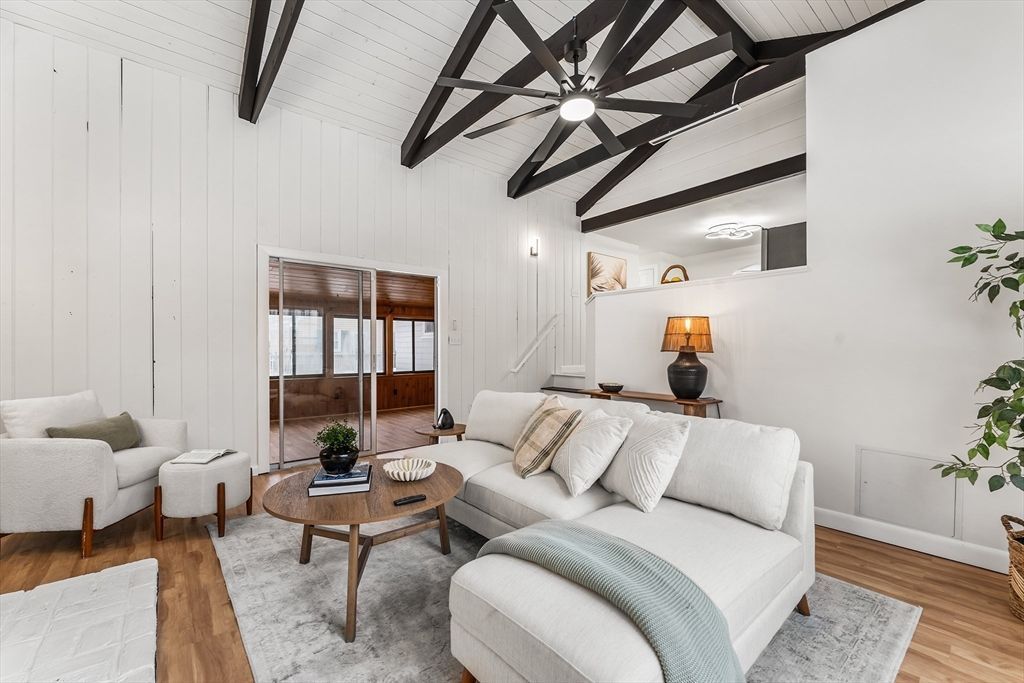 Living Room: Ceiling Fan(s), Vaulted Ceiling(s), Flooring - Wood