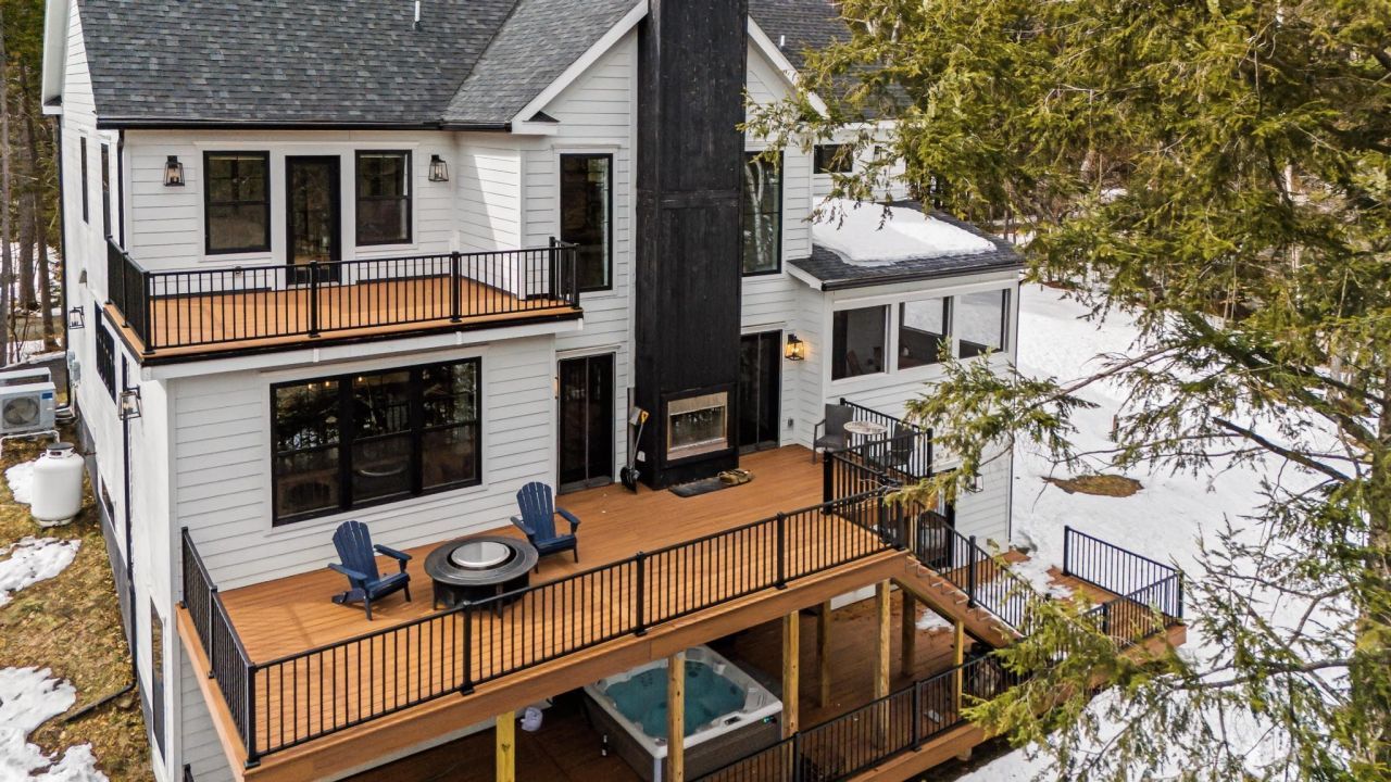 Experience refined mountain living in this luxury mountain retreat located in one of Vermont's most beloved ski destinations in the heart of the Mad River Valley. Perfectly positioned between Lincoln Peak and Mount Ellen, just minutes from Sugarbush Resort and located on the Sugarbush shuttle route. Completed in 2021, this modern home sits on 2.1 acres and offers approx 5,000 square feet of thoughtfully designed living space across three levels, including a fully equipped lower-level walk-out accessory apartment ideal for guests or rental, complete with a full kitchen and private deck with a hot tub. The main level features an open-concept layout with a dramatic great room rising to the second floor. Ten-foot ceilings and expansive Anderson black-frame windows fill the space with natural light while framing the surrounding landscape. A wood-burning fireplace anchors the living area. The luxurious chef's kitchen is designed for both function and entertaining, featuring Bertazzoni appliances and an oversized island with quartz countertop. The main level is complete with a bedroom, a full bathroom, a mudroom and washer/dryer. The second level offers a private retreat. A large landing overlooks the great room below, creating an open connection between floors. The marvelous primary suite features an ensuite bathroom with a two-person walk-in shower and a private balcony overlooking the backyard. Two additional bedrooms share a Jack-and-Jill bathroom, providing comfortable living. Outdoor living is seamlessly integrated with a screened porch, an expansive three-level deck, and an outdoor fireplace. The backyard provides direct access to the Catamount Trail for year-round recreation. Energy-efficient systems include central air conditioning and multiple heating options, such as heat pumps, propane fireplace, and wood-burning fireplace. Fully furnished and move-in ready, this mountain retreat invites you into a lifestyle shaped by the seasons, where luxury meets simplicity